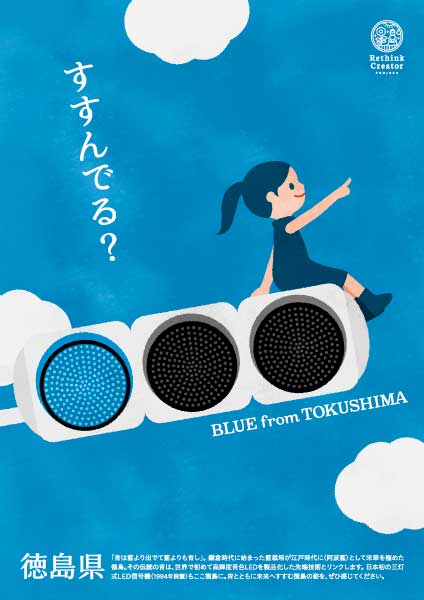 これらの材料をどのように表現するのかと考える中で情報収集をしていたところ、日本初の三灯式LED信号機が徳島県にあるという事実にたどりつきました。青信号は「すすめ」です。かつて藍で栄えた徳島は当時もっとも「すすんだ」国であったし、青色LEDを発明する技術も間違いなく「すすんで」います。ここで、メインビジュアルの三灯式LED信号機とキャッチコピー「すすんでる?」が決定しました(そういえば、信号機がLEDに変わる端境期、県外から来た人に「徳島は田舎なのになぜLEDの信号機に変わっているのか」と聞かれることがよくありました。本当のことはわかりませんが、おそらく開発企業のお膝元であるということが影響していたのだと思われます)。